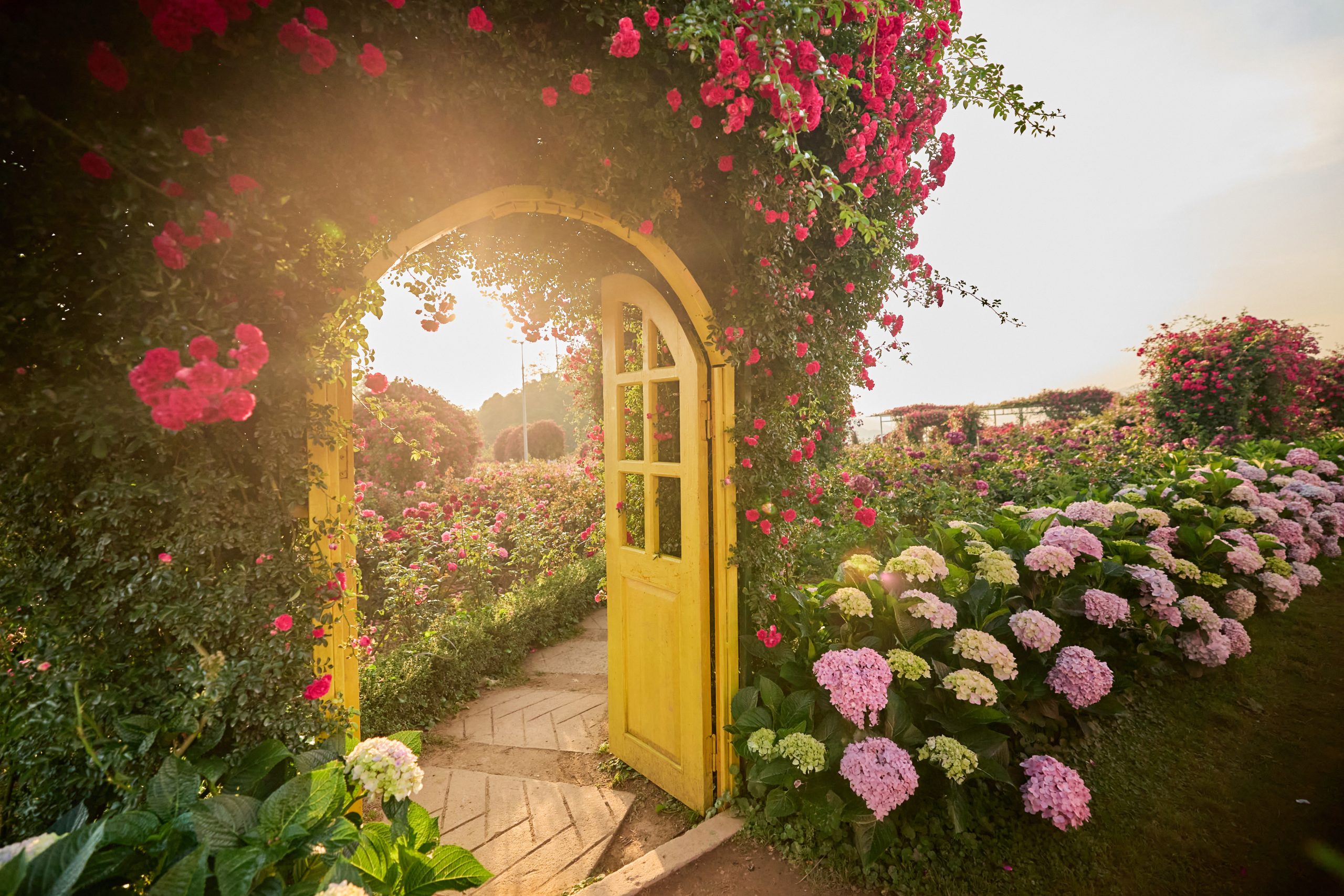 Each color tells a different emotion. The radiant yellow of Molineux and Golden Celebration evokes warmth. The purple of Blue Sky and Kate carries an air of mystery. Summer Snow and Creamy Eden Rose are as pure as morning dew. Together, they form a living symphony set against the majestic mountain landscape.