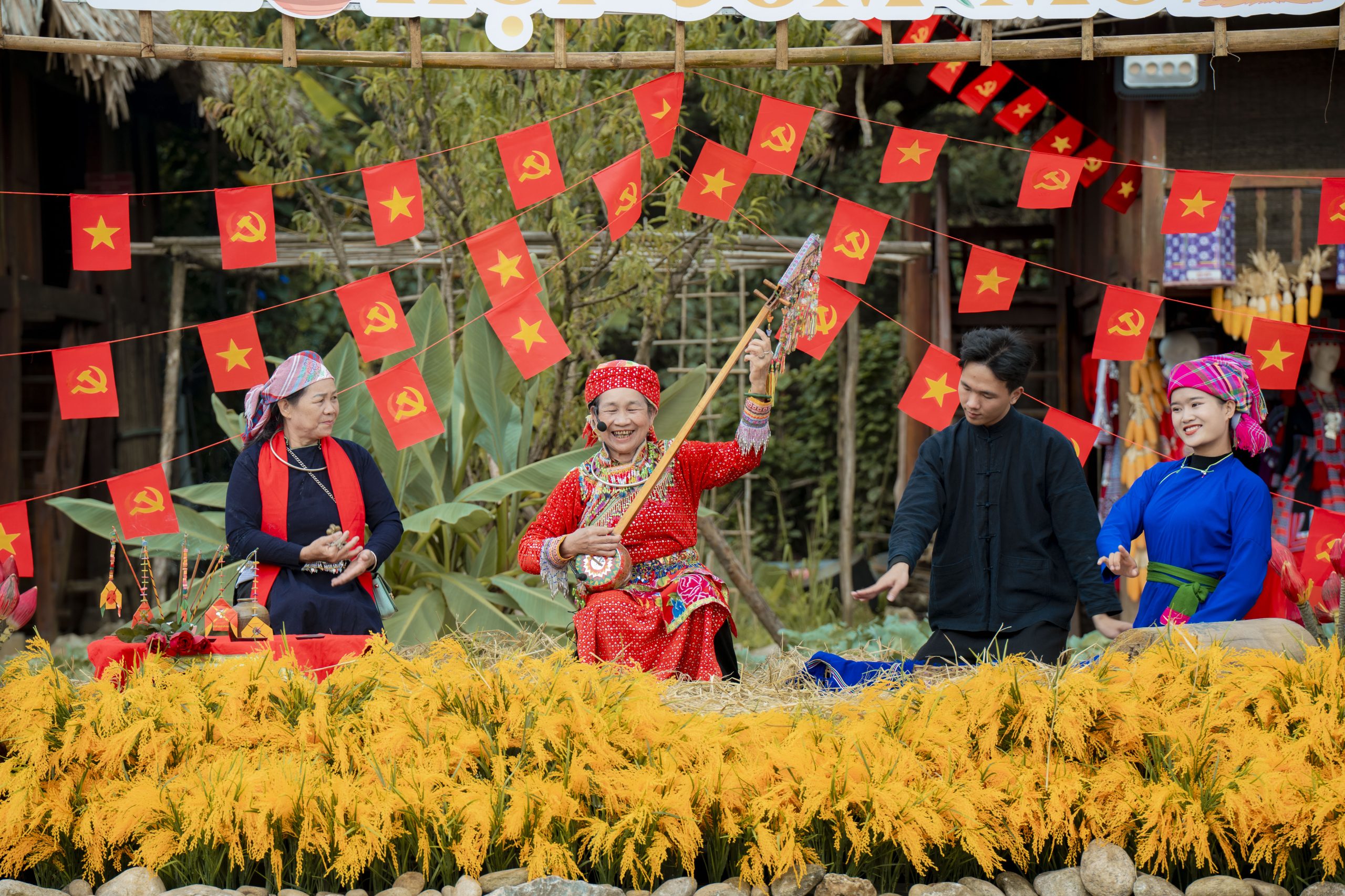 Hundreds of indigenous artisans in stunning traditional costumes walk alongside the floats. The sounds of khen pipes, drums, laughter, and chatter merge into a lively rhythm that echoes along the streets from San Quan to the Xuan Vien intersection.