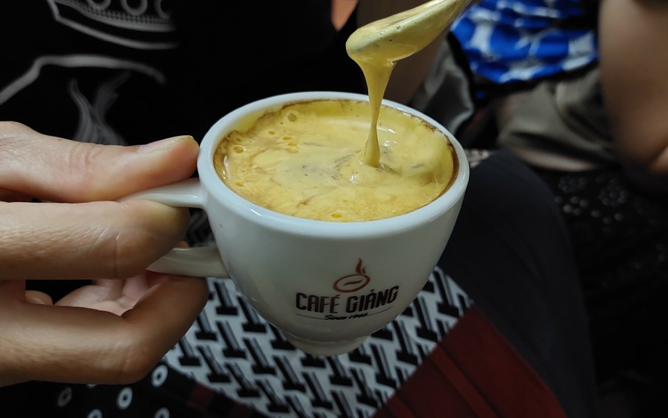 This drink combines strong Vietnamese coffee with a creamy layer of whipped egg yolk and condensed milk.