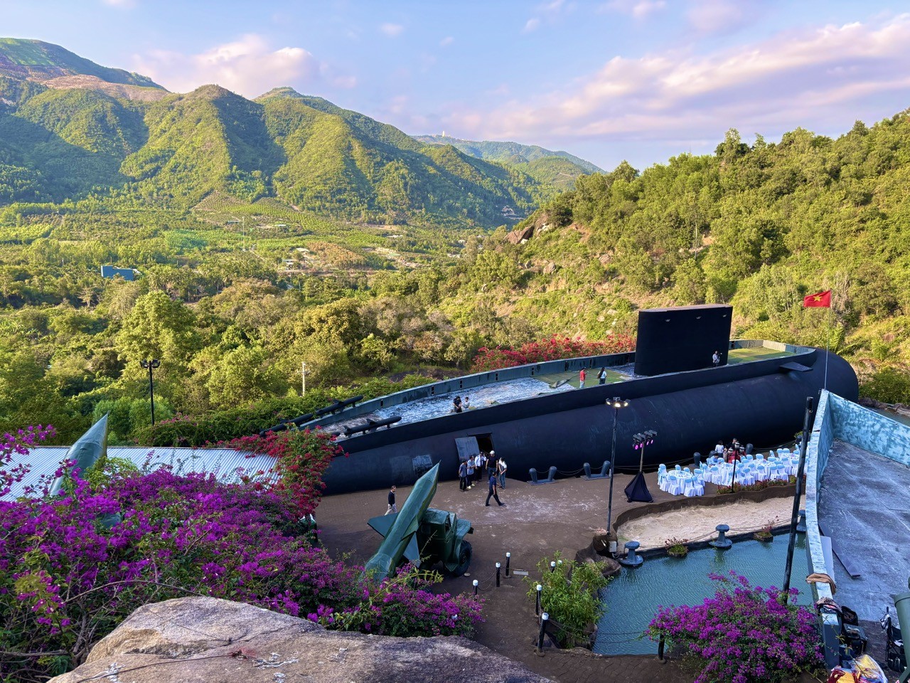 The submarine, a symbol of the deep ocean, appears amid mountain forests, creating a powerful visual contrast. It is precisely this contrast that compels visitors to pause, observe, and reflect.