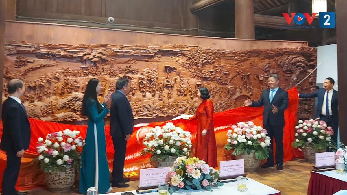 Created by artisan Bui Trong Lang, head of the Bui Gia Woodcarving Workshop in Ngoc Than traditional craft village, Hanoi, the “Vinh Quy Bai To” relief has achieved two national records: